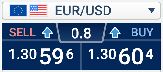 In this example of EUR/USD, a quote of sell price 1.30596 versus buy price 1.30604, (1.30604 – 1.30596 = 0.8) 0.8 is the price spread. For every 1 lot (equivalent to 10,000 EUR) traded for EUR/USD, each pip change in value is worth 1 USD of profit or loss on your trading account.