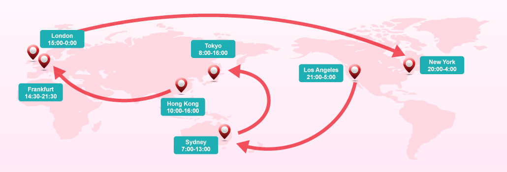 Due to the different geographical locations and time zones among all financial centres in the world, the foreign exchange markets operate 24 hours non-stop daily, thus forming a colossal market. The foreign exchange markets in Wellington, Sydney, Tokyo, Hong Kong, Frankfurt, London, and New York, etc. are closely interlinked, providing investors with an investment platform without time and space limitation. FX markets are only closed on Saturdays, Sundays and at important national festivals of respective countries.