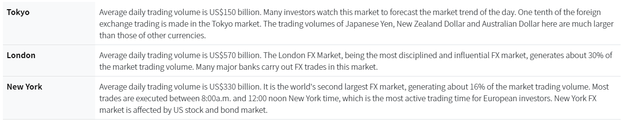 Due to the unique geographical location of London which connecting the Asian and North American markets: London market opens when Asian markets closes, and it closes when New York market opens; trading is extremely active during this period, and this makes London the world’s largest FX trading centre and it has significant impact to the FX market trend.